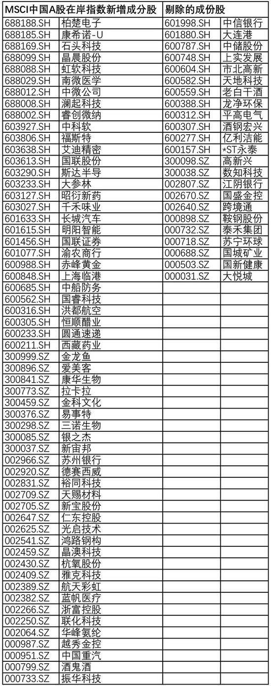 今年 3 月富时罗素第一阶段最后一次扩容之后,今年大概率再无针对 a 股的新增国际指数纳入计划。. 2月13日北京时间早晨6时,明晟公司 (msci)公布季度调整名单出炉。 根据公告,msci中国a 股在岸指数(msci china a onshore indexes)增加了六只 成分股 ,分别是金山办公、京沪高铁、上海莱士、深科技、天风证券、中天金融,没有成分股被剔除。 2月13日北京时间早晨6时,明晟公司(msci)公布季度调整名单出炉。 根据公告,msci中国a 股在岸指数(msci china a onshore indexes)增加了六只成分股,分别是金山办公、京沪高铁、上海莱士、深科技、天风证券、中天金融,没有成分股被剔除。